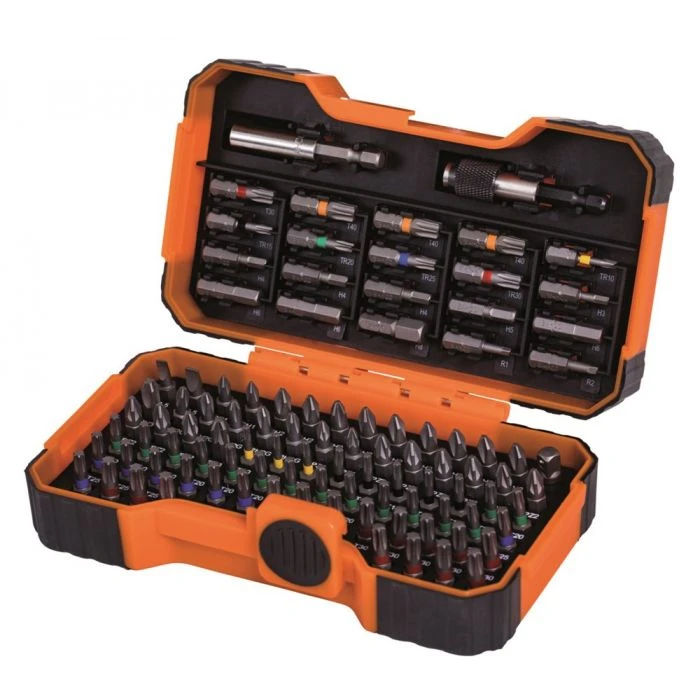 - Bitset, 100-delig met Gleuf, Phillips, Pozidriv, Hexagon, Robertson en gekleurde TORX®,TORX® Tamper, bits