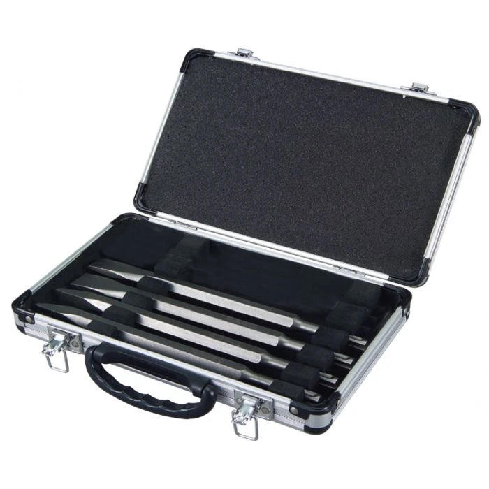 4-delige beitelset met SDS-PLUS aansluiting, bestaande uit: 2x puntbeitel 250mm 2x koudbeitel 20x250mm In aluminium koffer.