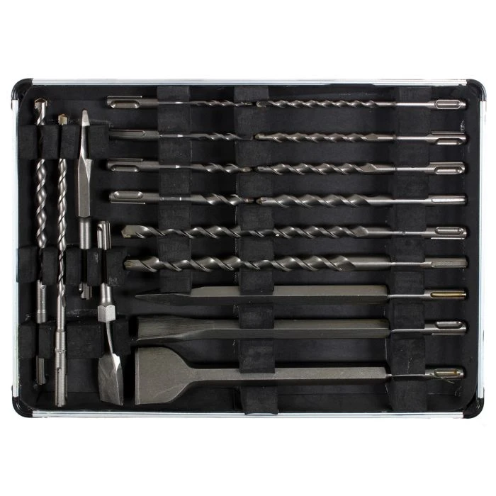 De set bestaat uit een 12-delig betonboren assortiment 5-14mm, 2x puntbeitel 140/250mm, 2x platbeitel [140×20, 250×20] en schraapbeitel 250x40mm.