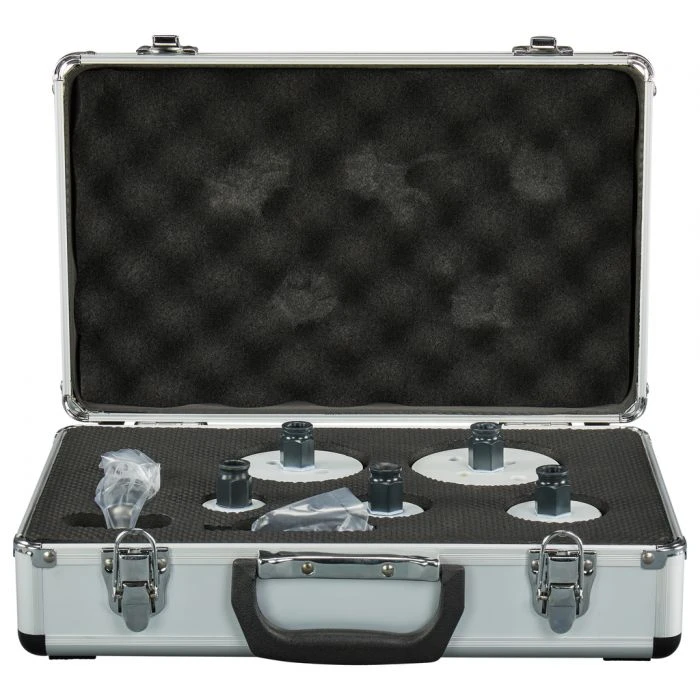7-delige gatzaagset BiM in aluminium koffer, bestaande uit gatzagen in diameters 32, 41, 51, 73, 83, een Ezychange snelwissel adapter met HSS-G centreerboor en een extra HSS-Co centreerboor.