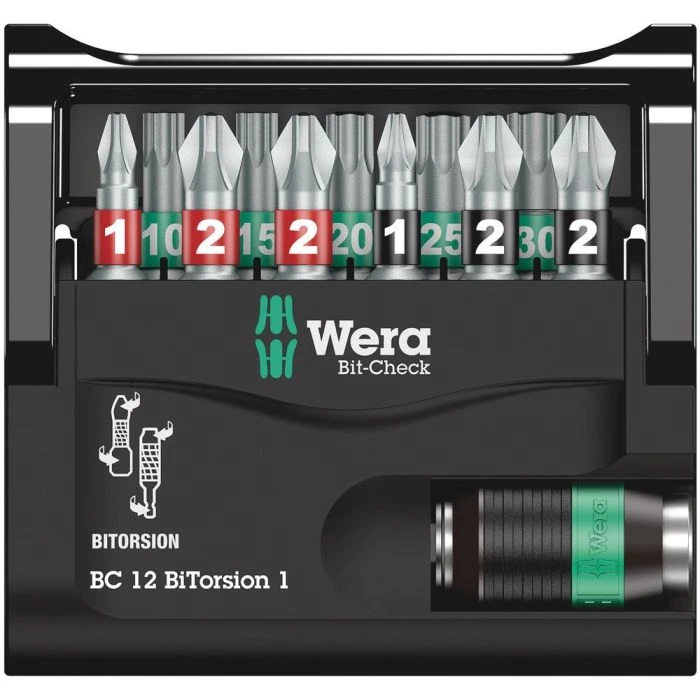 Extreem harde bits, voor universeel gebruik. BiTorsion-bits met torsiezone, waarin bij belastingspieken kinetische energie wordt afgeleid. Met zachte BiTorsion-zone om torderen van de bit-punt bij hoge belastingen te voorkomen. Hierdoor wordt de levensduur van het product aanzienlijk hoger. Met bijpassende houder ter verlenging van de levensduur. Voorzien van Rapidaptor-technologie, om de bits te kunnen plaatsen zonder daartoe de huls te moeten bedienen. Om de bits weer te verwijderen, hoeft u de huls slechts naar voren te schuiven – zo kunt u bits zelfs met 1 hand razendsnel wisselen. Voor plaatsing van bits met 1/4″ buitenzeskant-aandrijving conform DIN ISO 1173-C 6,3 en E 6,3. Voor plaatsing in de schroefboormachine of in boorkop van een elektronisch geregelde boormachine. De meerdelige Bit-Check overtuigt door het lage gewicht en uitstekende compactheid. Daarbij zorgt het zachte materiaal in het onderste gedeelte van de Bit-Check voor een betere houvast voor de bits en maakt tegelijk het uitnemen daarvan makkelijker. Het profiel en het formaat van de bits zijn gemakkelijk te herkennen dankzij de Wera ‘Take it easy’-Toolfinder met kleurcodering en duidelijk zichtbare beschrijving.
